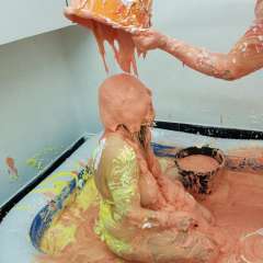 Sugarbabe rolled around with creamytights on a tarp covered with custard